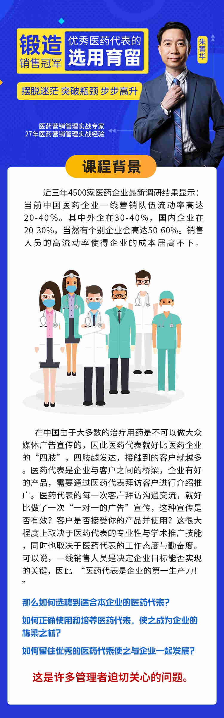 朱老师在92年就步入医药营销行业,曾多次带领团队将药品销售额排行提升10倍以上。
