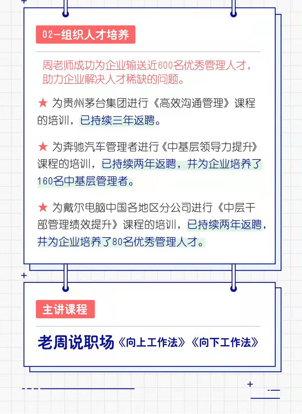 为贵州茅台集团进行《高效沟通管理》课程的培训,已持续三年返聘。